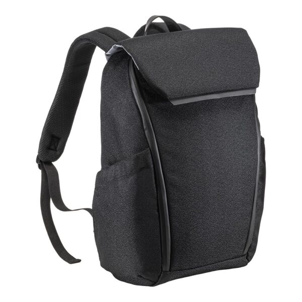 Zaino porta pc (15) in poliestere riciclato jacquard 600D (lining interno in R-PET). Compartimento imbottito per notebook. Ampia tasca frontale con chiusura superiore magnetica. Maniglia superiore in plastica rigida. Schienale e spallacci imbottiti con materiale traspirante. Sistema di aggancio ai trolley