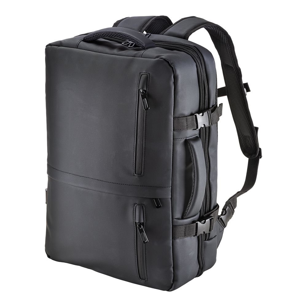 Zaino da viaggio con porta pc (15). Ampio scomparto principale con tasca retinata. Due tasche frontali verticali con zip e una orizzontale con zip. Schienale e spallacci imbottiti con materiale traspirante. Sistema d aggancio ai trolley